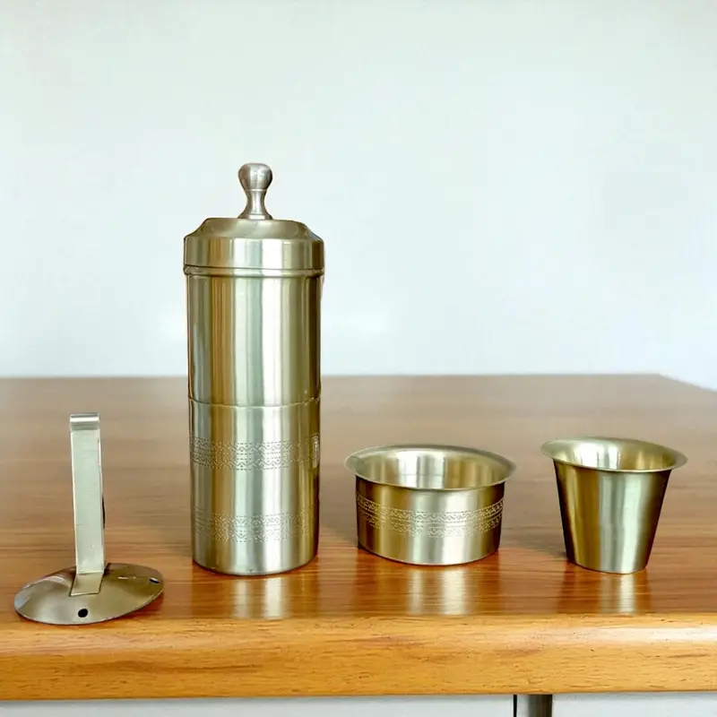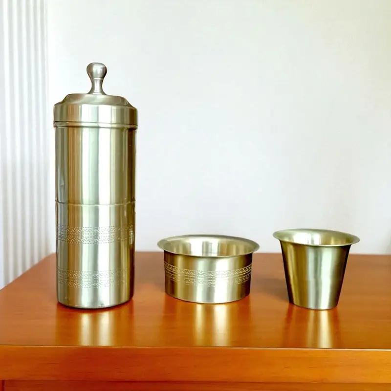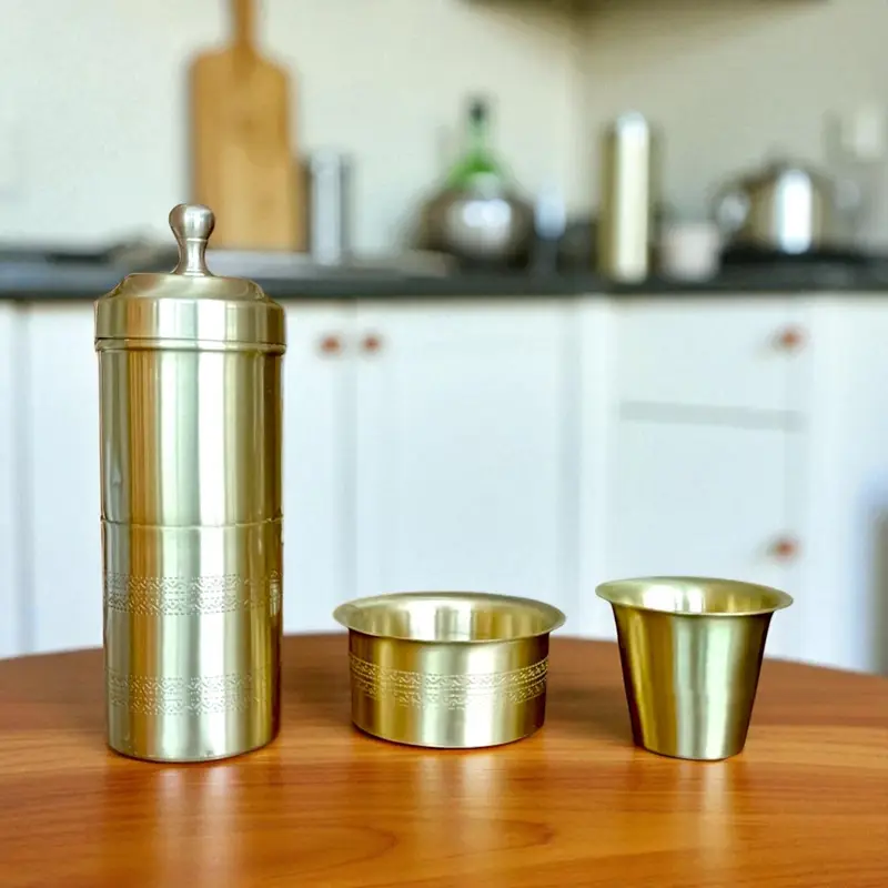- This premium gift set includes a traditional brass coffee filter, expertly designed to brew rich, aromatic South Indian filter coffee, delivering an authentic coffee experience at home.