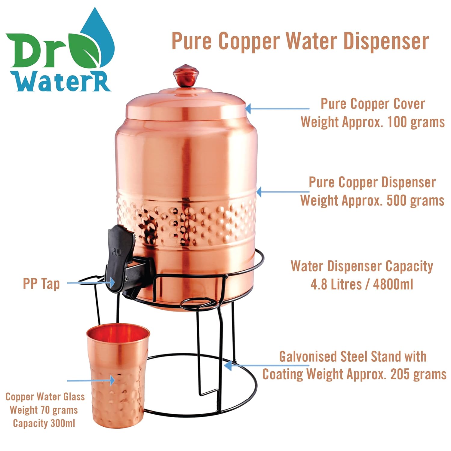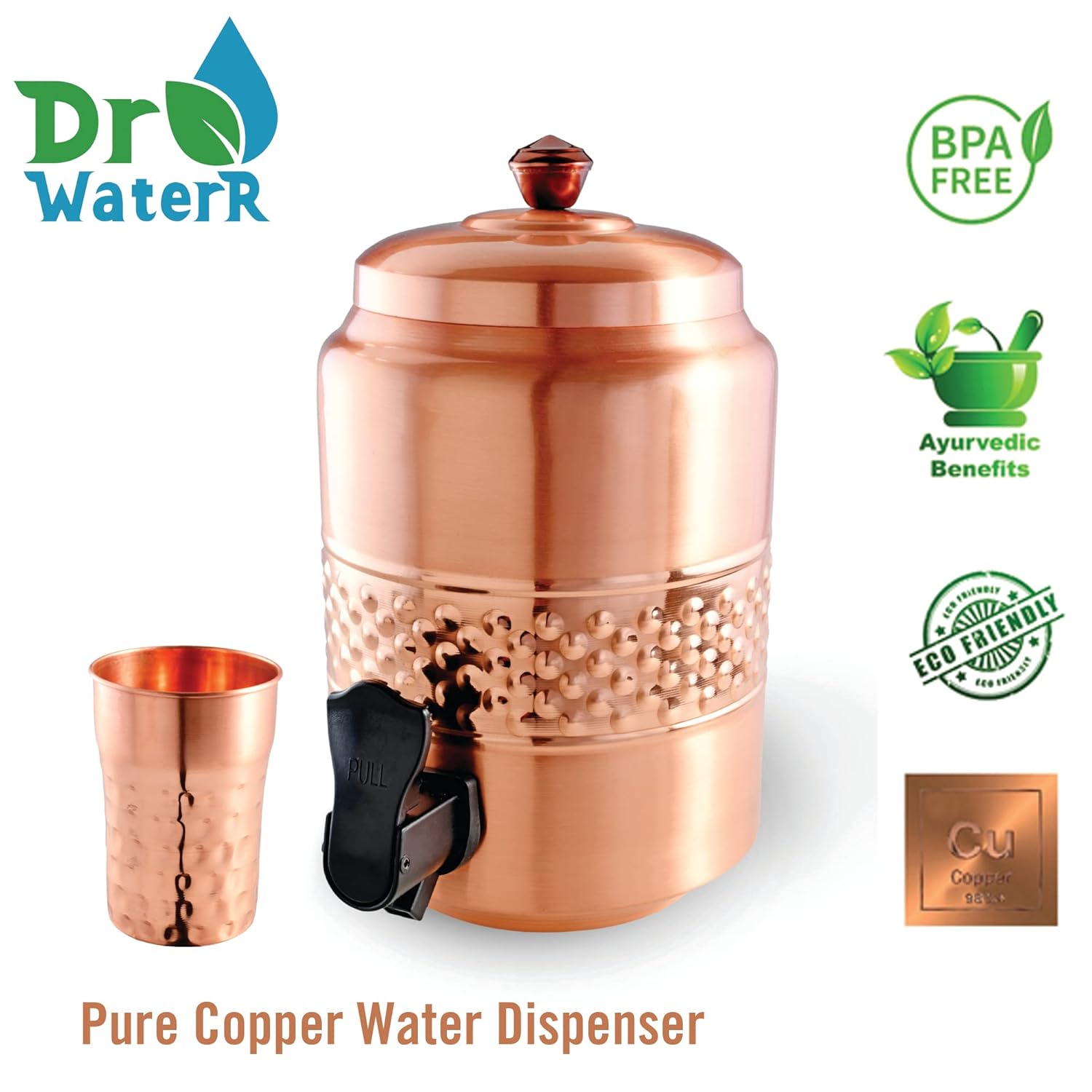 • 1. Health benefits: Dr. WaterR Water Dispenser is made of Copper which has antimicrobial properties that can help kill bacteria and viruses, making it a hygienic option for storing and dispensing drinking water. We recommend to refer Ayurveda to know more health benefits on articles made of Pure Copper.