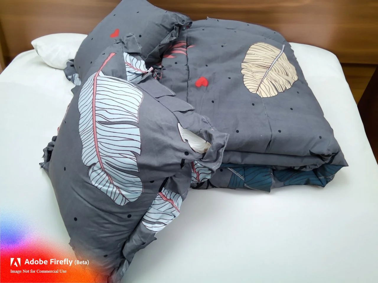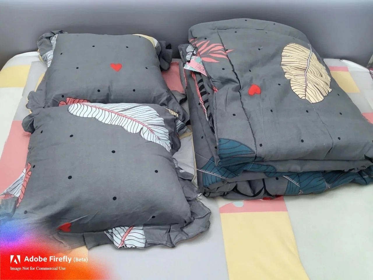 • Package contents: 1pc comforter: 220 X 240 cms, 2pc Cushions (Filled):  40 X 40 cms (Frill).