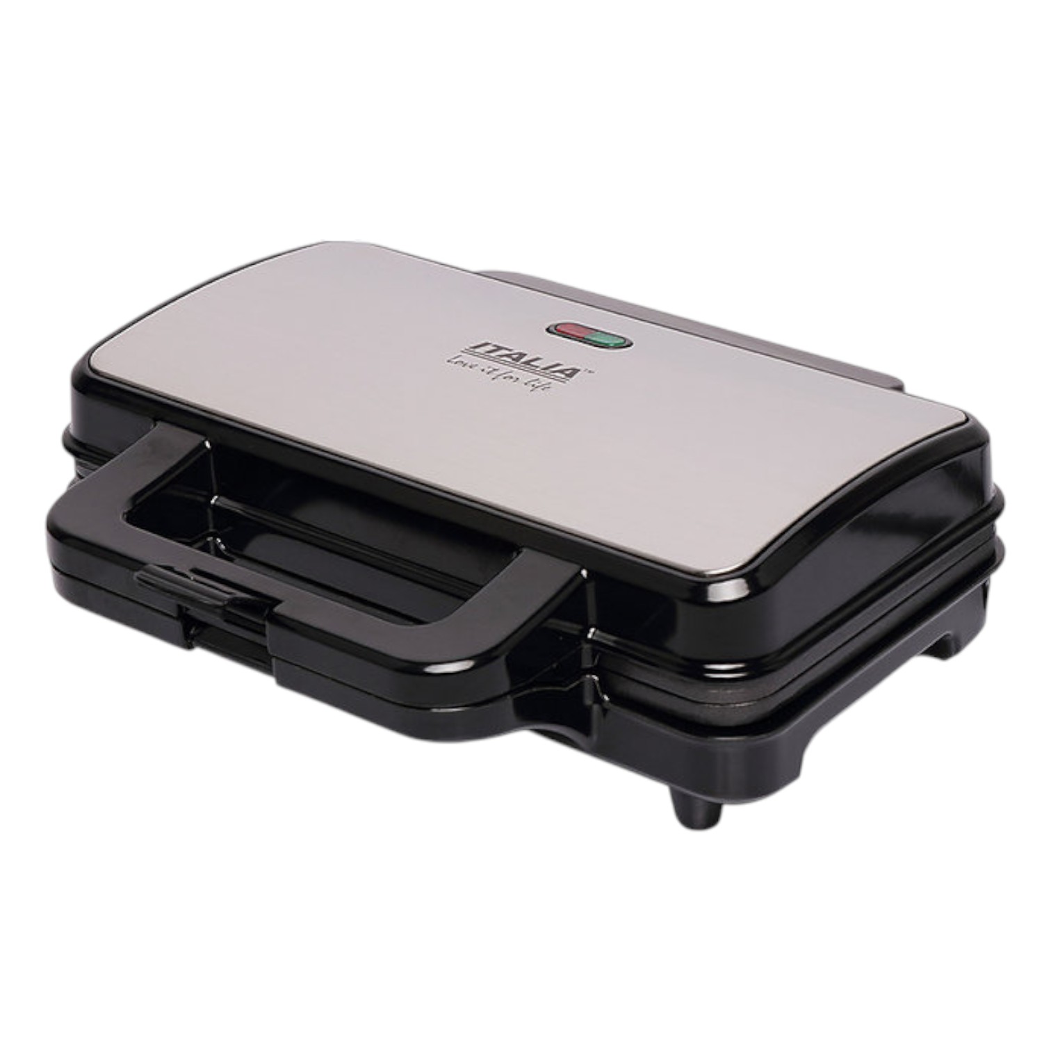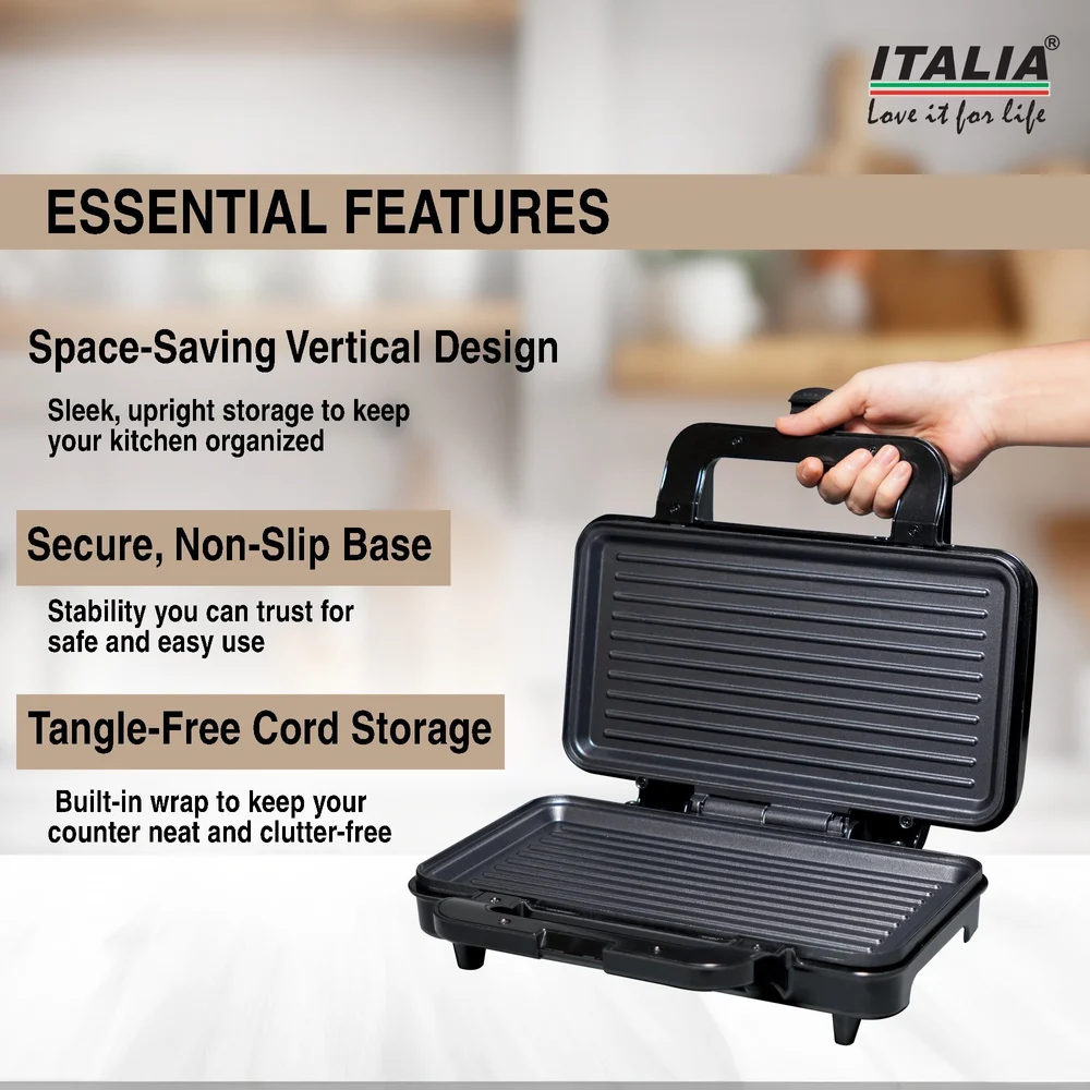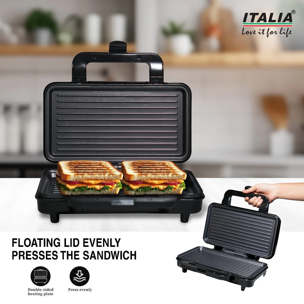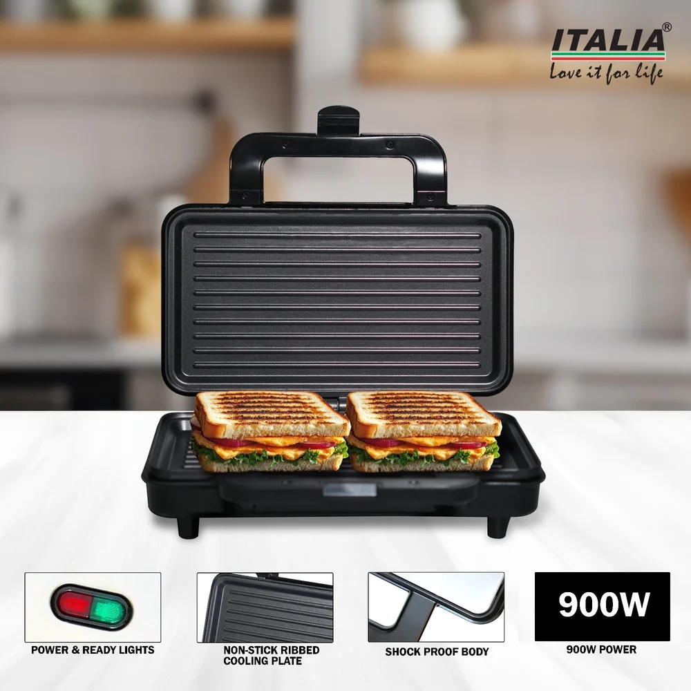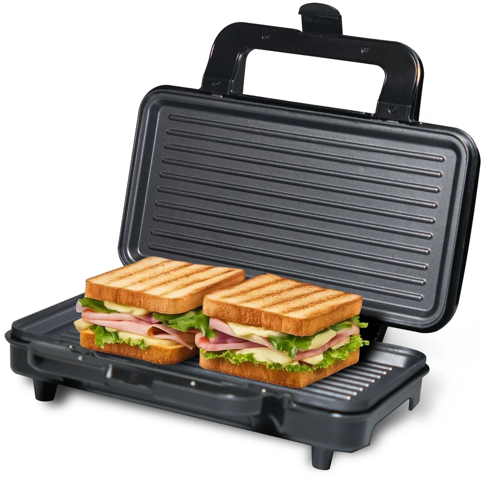 - Wattage: 900W. 2 slice large grill plate. Cool touch handle.