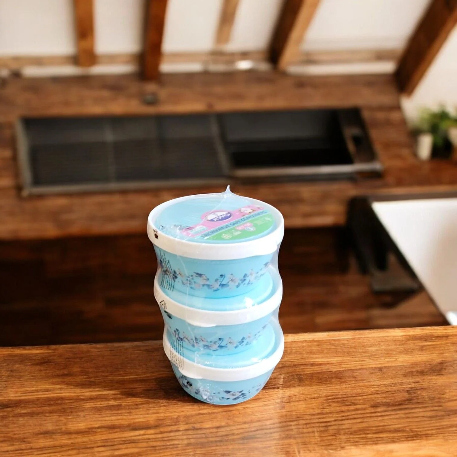 - This set contains 3 containers that can be used to store an array of food items in your kitchen. They can be neatly stacked in your cabinet with ease. This set is inclusive of 3 containers of different sizes that will expand your storage options.