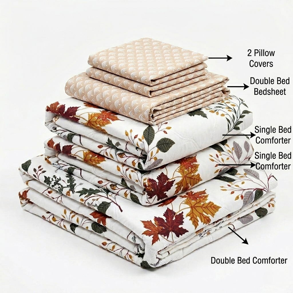 • Package contents: 1pc double bed bedsheet, 2pc single bed comforter, 2pc pillow covers, 1pc double bed comforter.