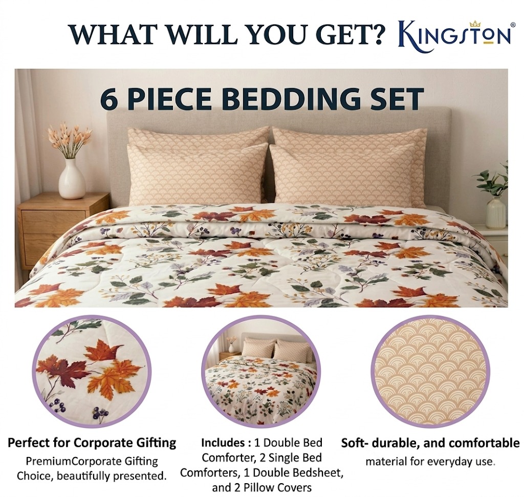Kingston 6 Pieces Bedroom Set (1pc Double Bed Bedsheet, 2pc Pillow Covers, 1pc Double Bed Comforter, 2pc Single Bed Comforter) | Cozy, Ultra Soft & Breathable | Comfortable