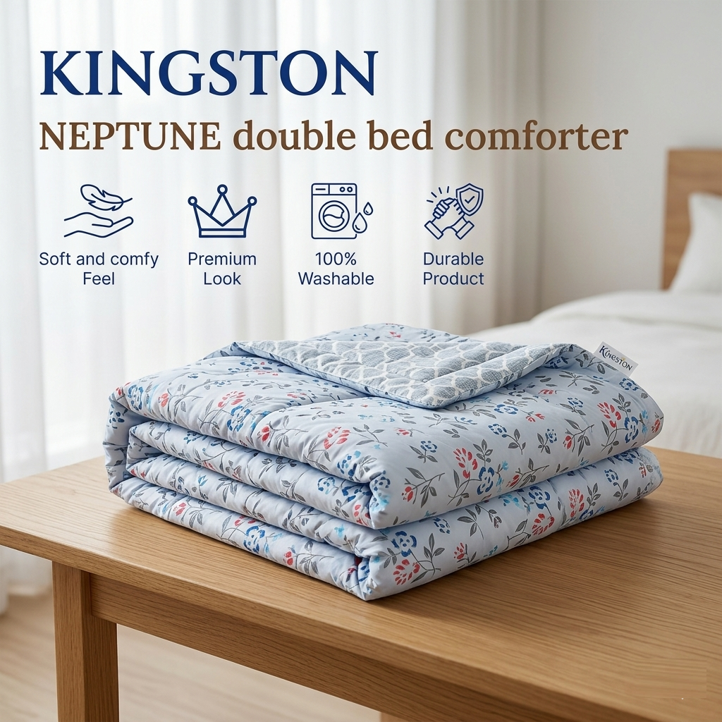 Upgrade your sleeping experience 😴 with the Kingston Neptune Double Bed Comforter 🛏️, designed to deliver the perfect balance of warmth, comfort, and style ✨. Crafted using high-quality fabric and ultra-soft filling ☁️, this premium comforter ensures a cozy and restful sleep in all seasons, especially during winters ❄️.