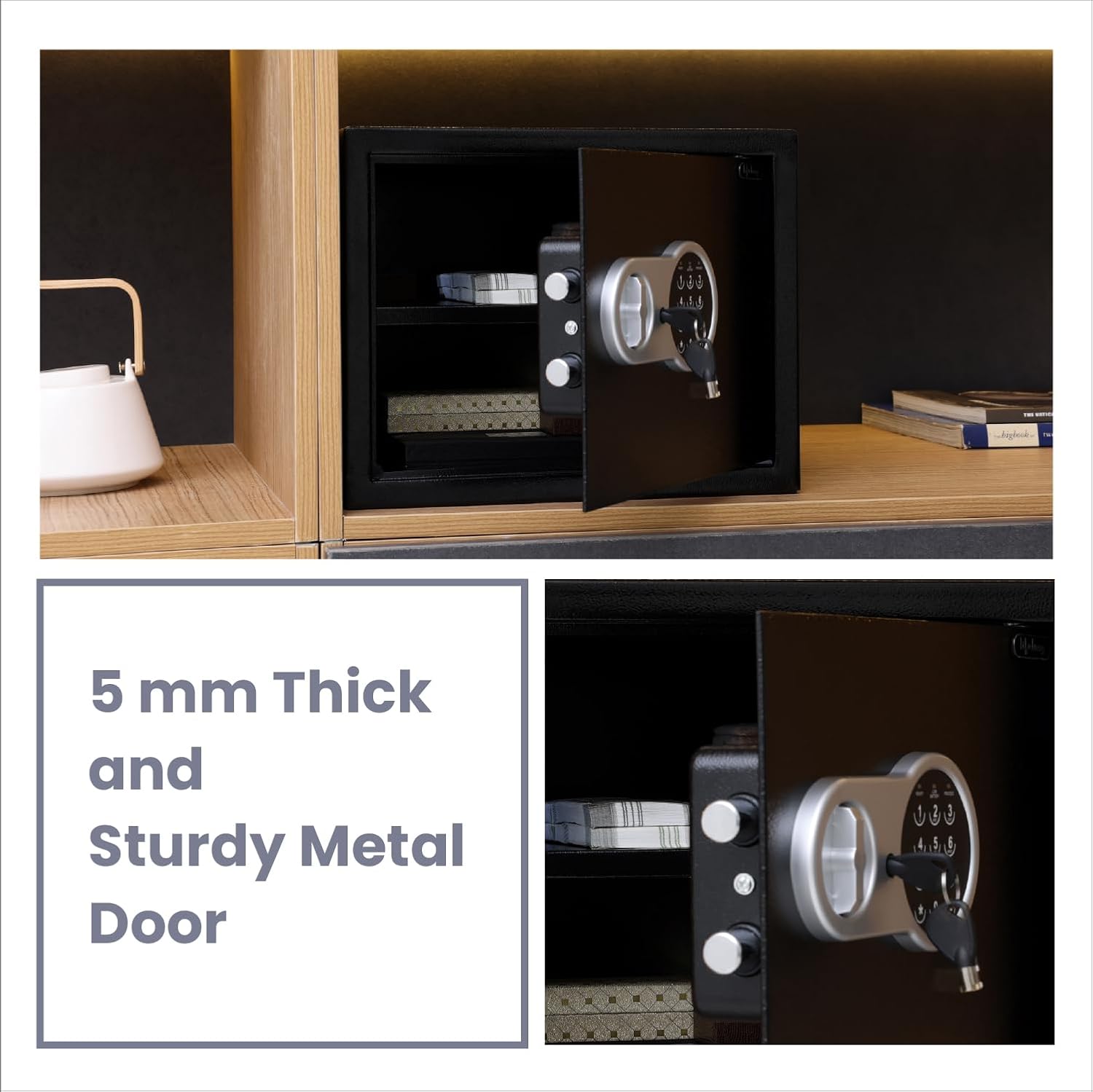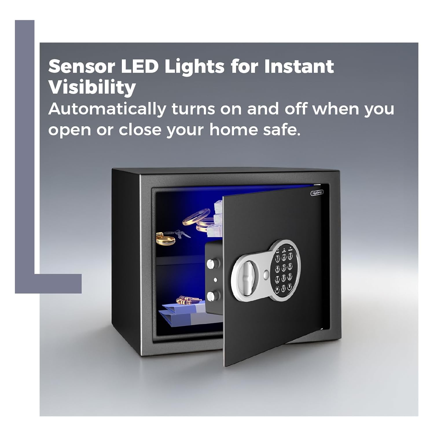 • 1.2 cubic feet home safe for storing important documents, jewellery, and other valuables. Programmable electronic keypad ensures secure, easy operation; back-up key for emergency use​