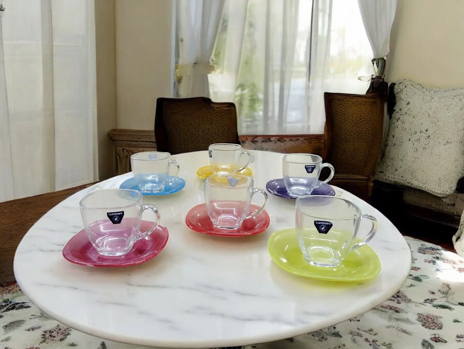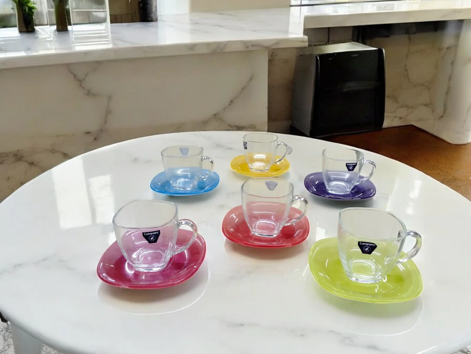 - This Tea/coffee Cup Saucer set features a minimalist glass design with a pop of colour, which makes it look just as fantastic full of coffee as it does on display in your kitchen.