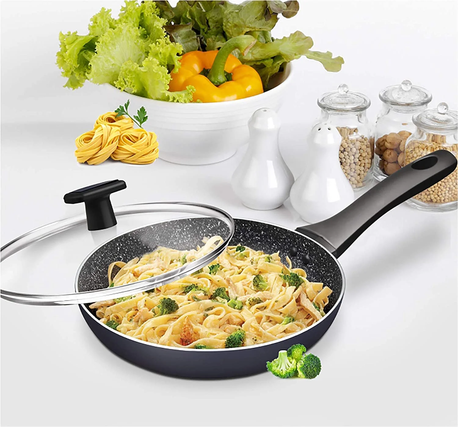 - Durable and Healthy Cooking Solution: The fry pan boasts a robust aluminum construction and a five-layer non-stick granite-finish coating that is PFOA-free. With a thickness of 3 mm, it ensures even heat distribution for perfect cooking results. This design allows for low-fat and low-oil cooking, making it a healthier option for your kitchen.