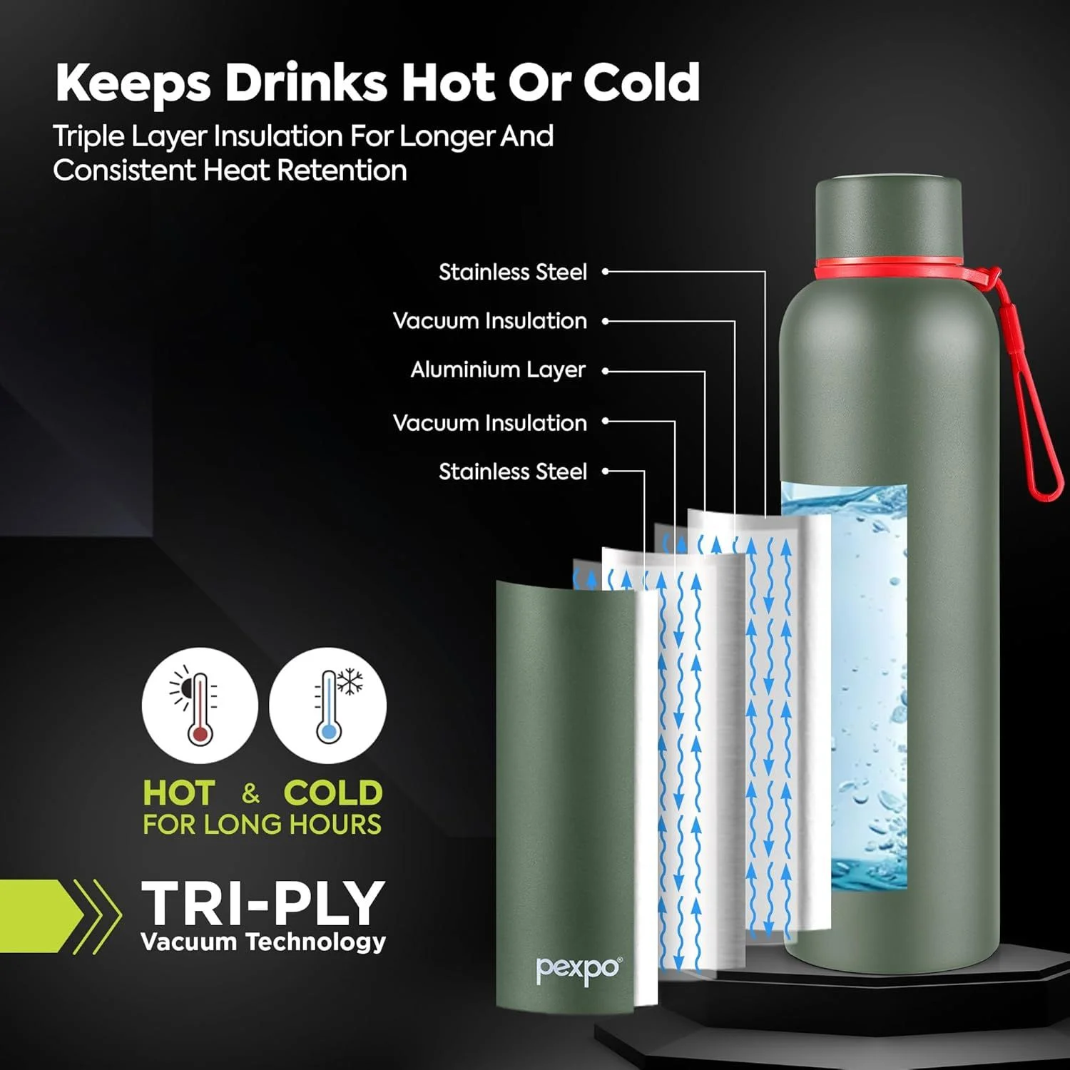 - ISI CERTIFIED QUALITY: Each Pexpo Thermos bottle meets strict Indian safety and quality benchmarks. It ensures the steel used is food-safe, the insulation performs as promised, and the bottle is durable and leakproof – giving you trusted protection and reliable performance with every use