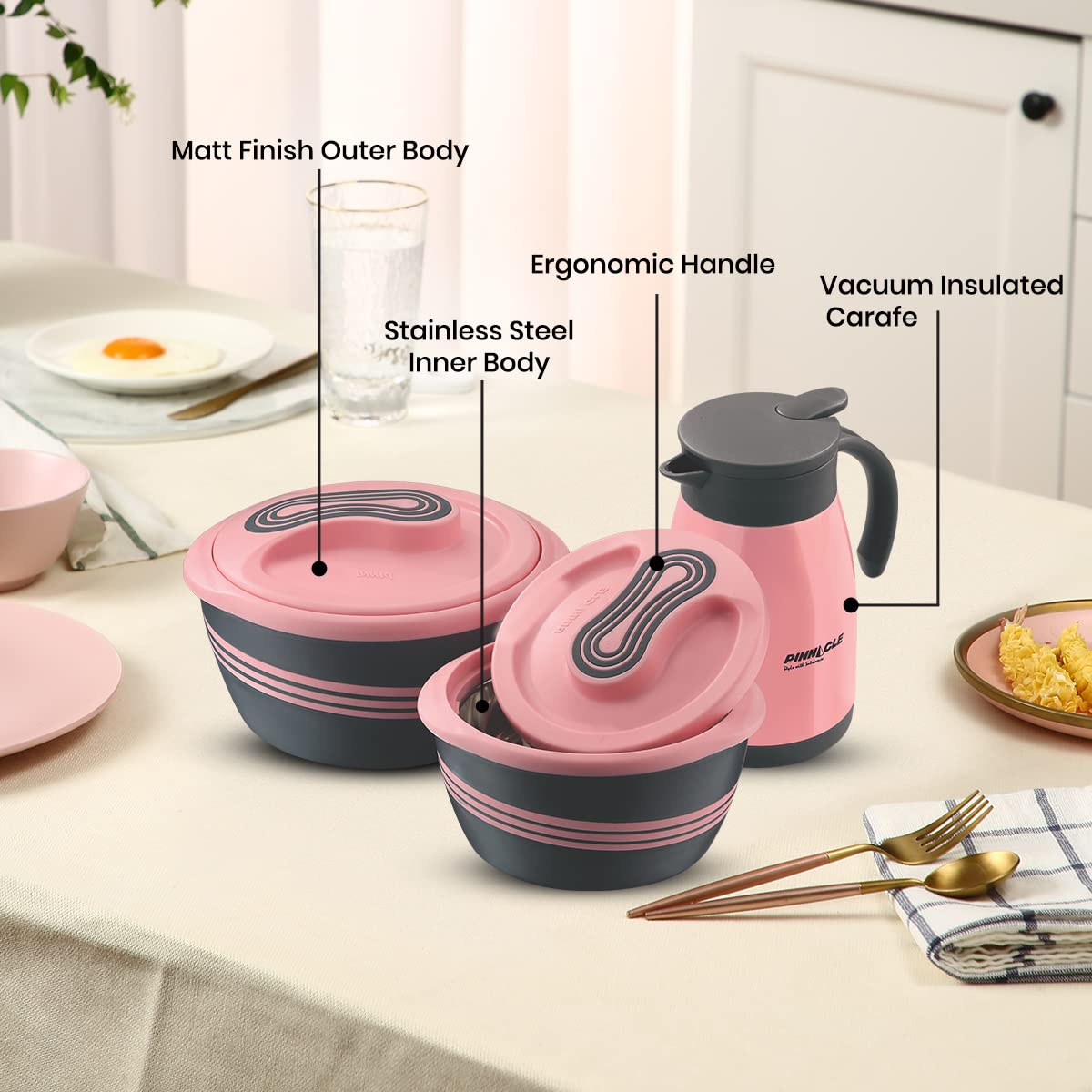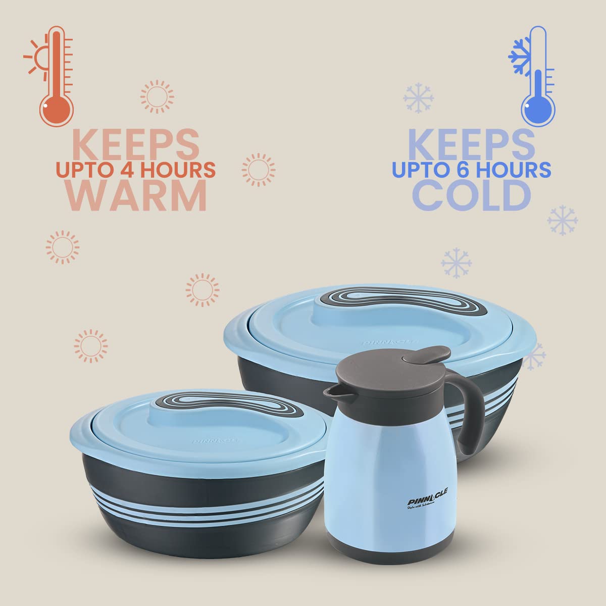 - KEEPS FOOD HYGIENIC & WARM: This Pinnacle casserole set of 3 comes with flask which is made of BPA free and FDA approved material for best health and hygiene. These come with a functional lid and inner stainless steel wall for each casserole and kettle to keep your food hot for a longer period of time