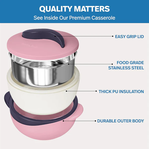 - Functional Insulation: This insulated casserole is designed to maintain food temperature for extended periods, making it ideal for both hot and cold dishes. Also if used as casserole for roti, it ensures that your chapati or roti stays warm and fresh. Perfect as a roti box for the kitchen or a hot pot for roti