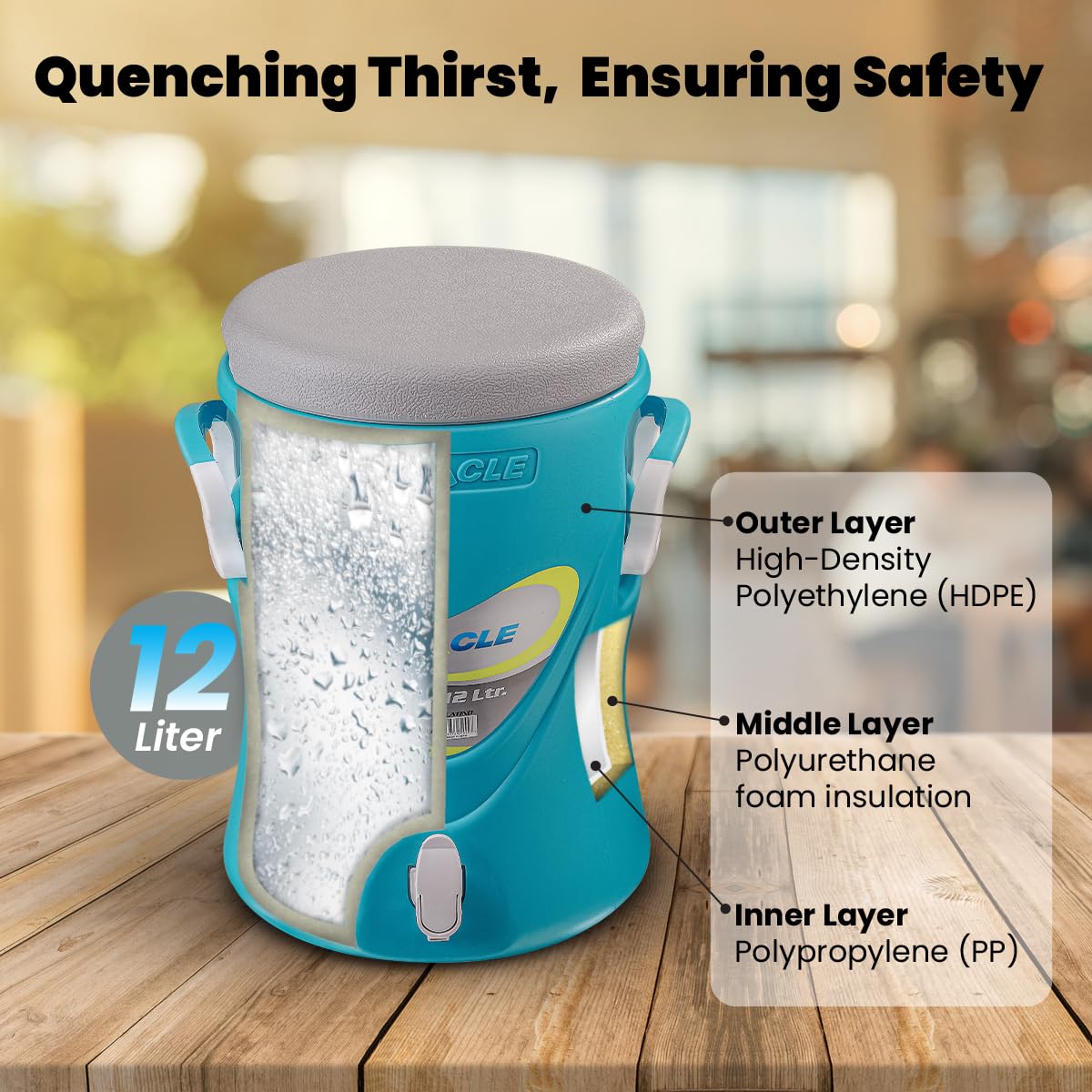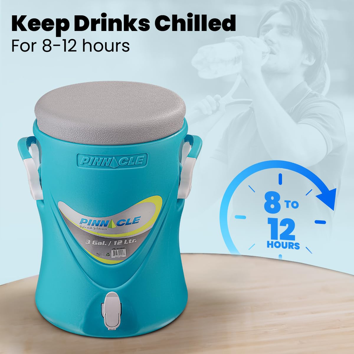 - Premium PU Insulation – Crafted with thick PU insulation, this 12-litre water jug maintains optimal temperature longer, keeping beverages cold for 8-12 hours.
