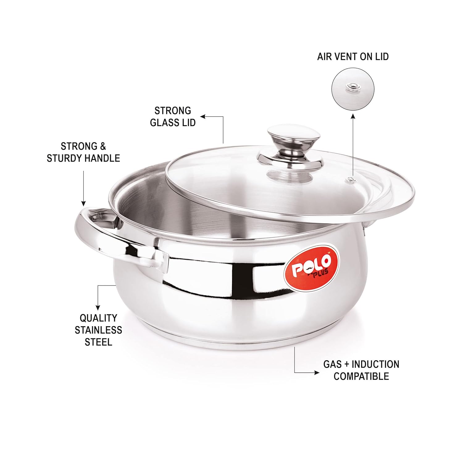 - It is a multi purpose cooking set. Easy to clean and hygenic stainless steel, Tri ply induction bottom. Made of heavy gauge stainless steel and tempered glass lid with steam release vents