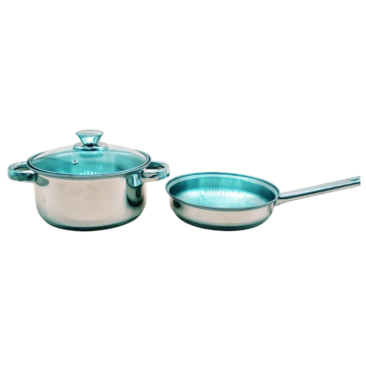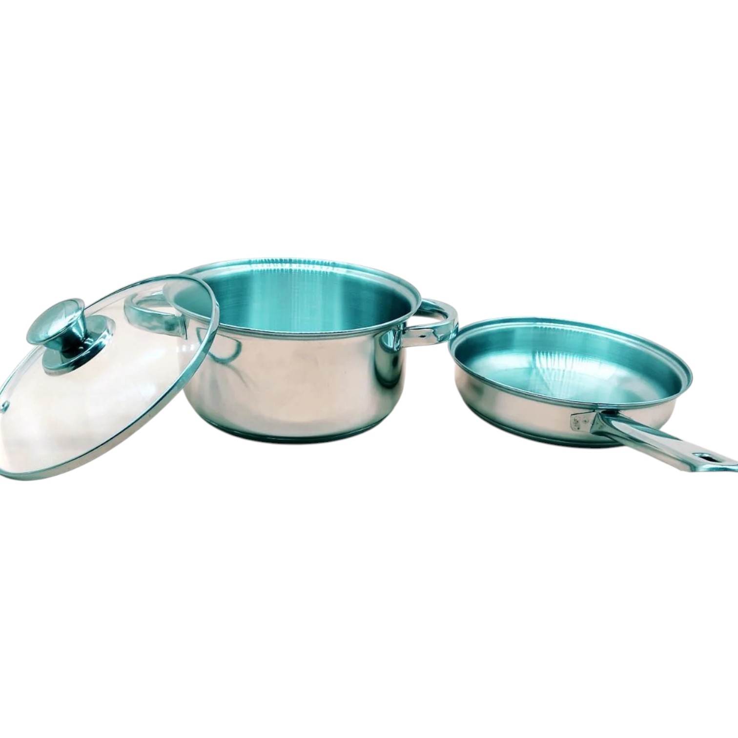 - Package Contents: 1pc SS Cooking Pot – 20cm, 1pc SS Fry Pan – 20cm, 1pc Common Glass Lid. It is a multi purpose cooking set. Easy to clean and hygienic stainless steel, Tri ply induction bottom