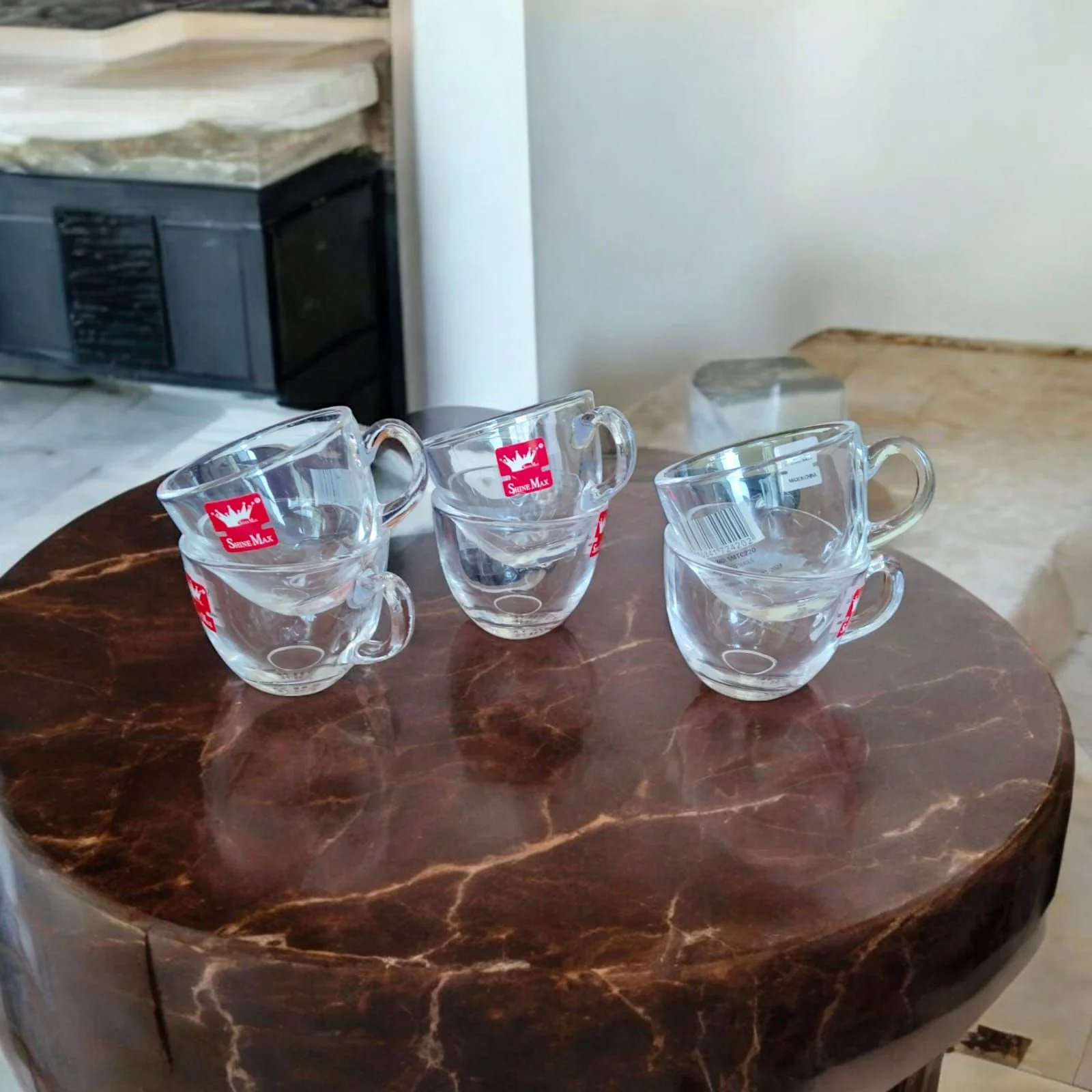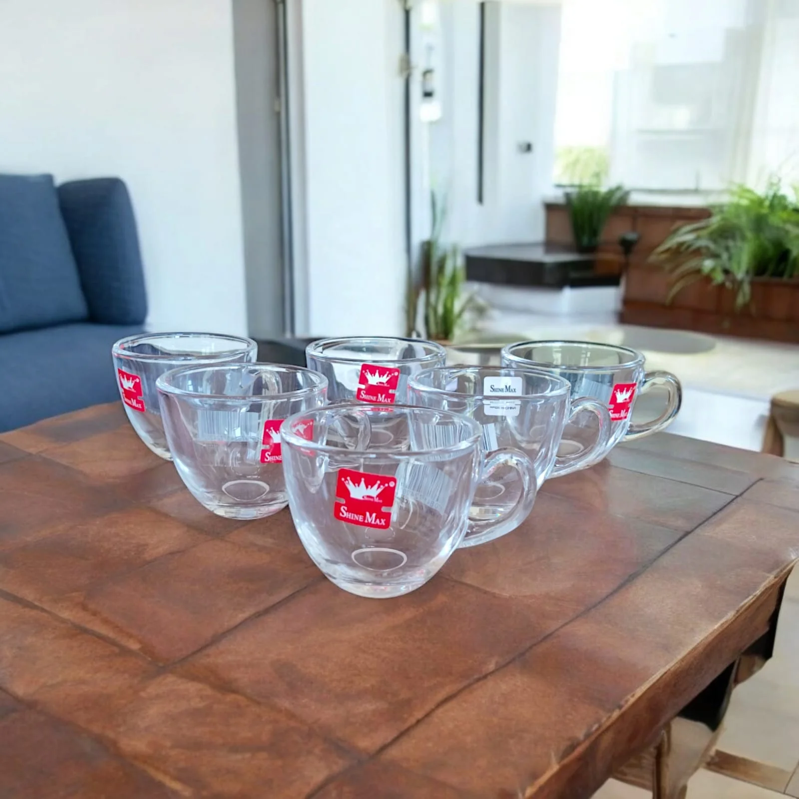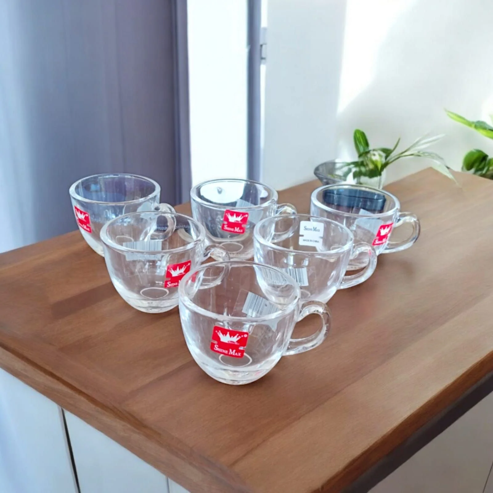 - This glass mugs come in a set of 6. The ideal everyday mug for enjoying steaming coffees, large lattes, cappuccinos, teas, smoothies or juices.