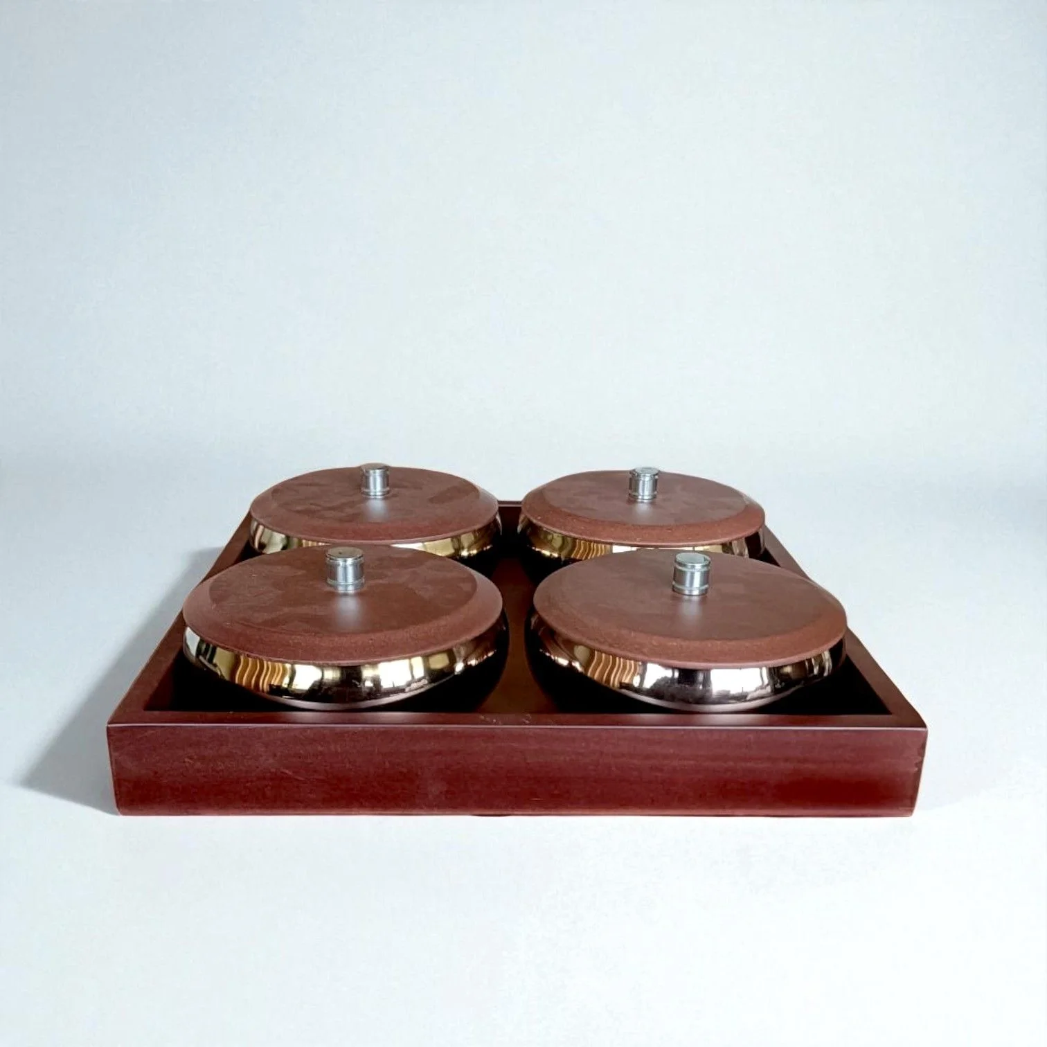 - Tray and Lids are made of Wood. The bowls have an elegant design with a mirror finish on the exterior.