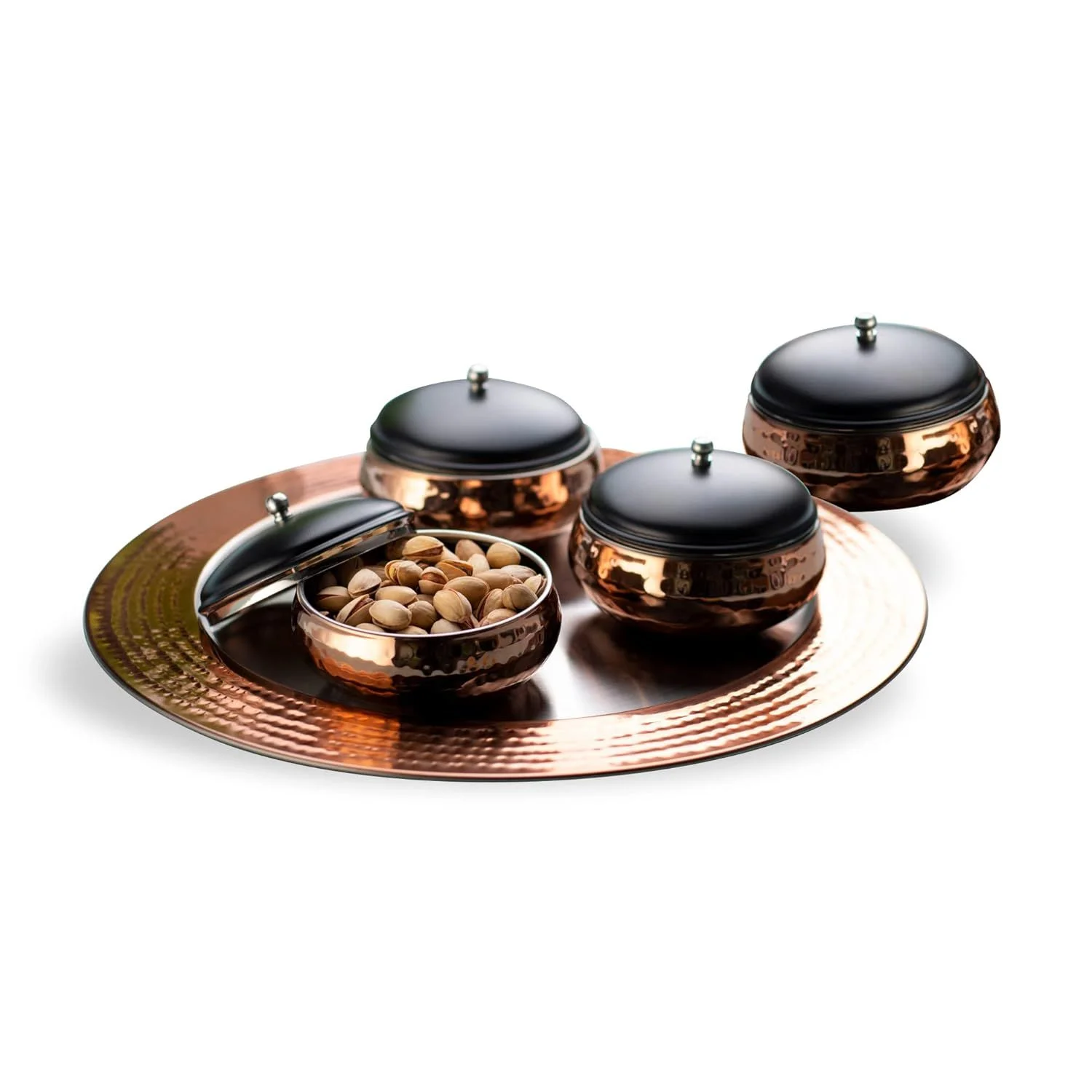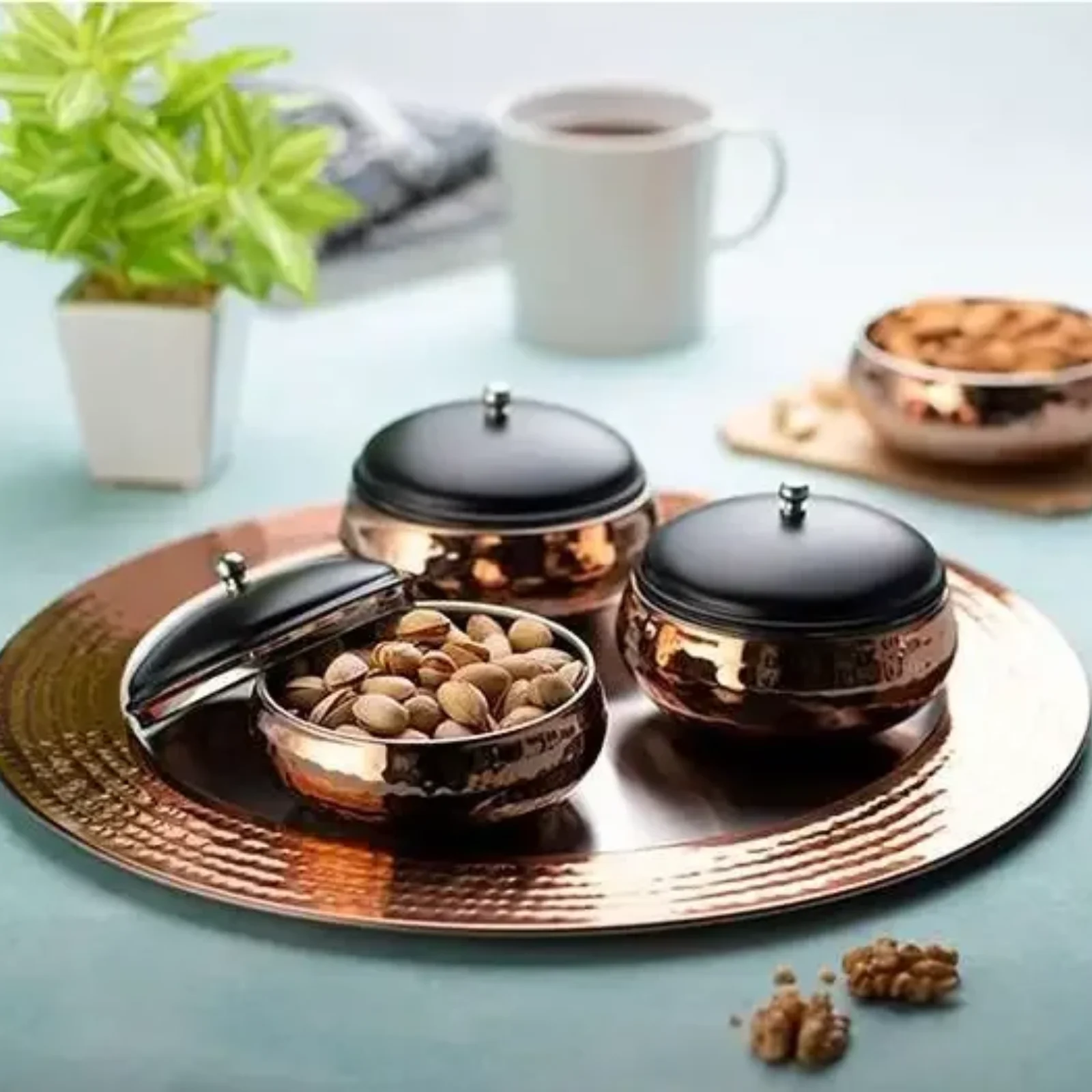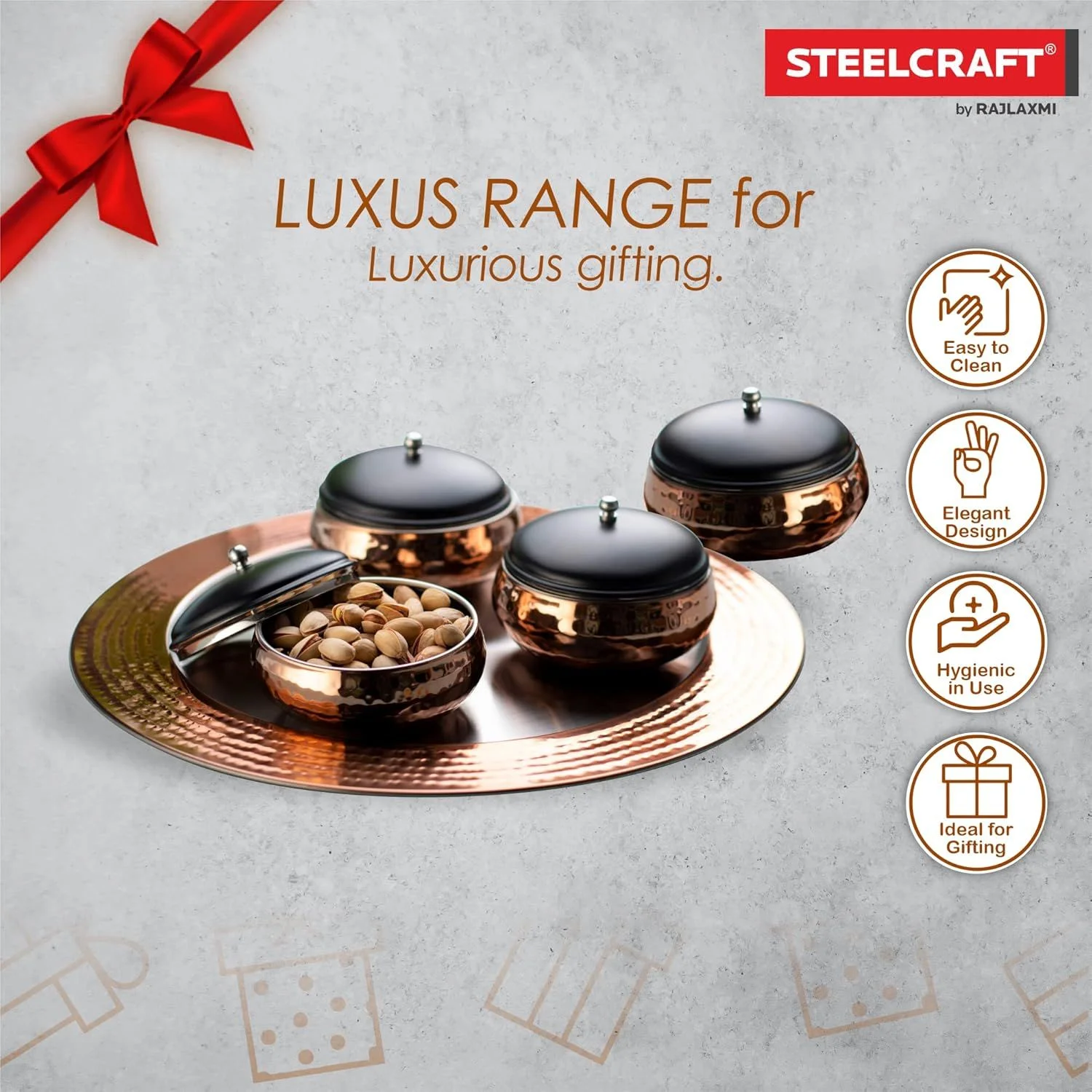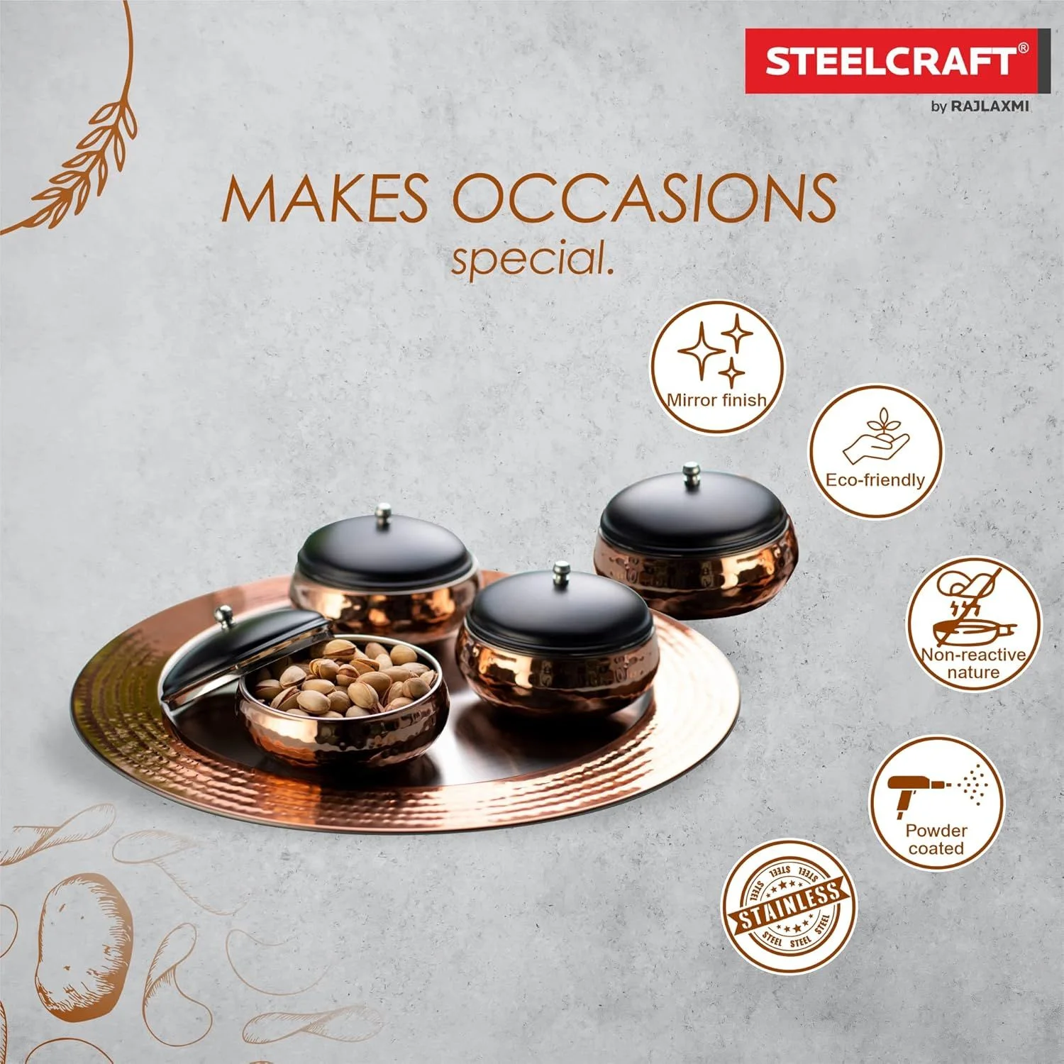 - Package Contains: 5 Pcs (1 Serving tray, 4 bowls with lid). Premium Stainless Steel Multipurpose Serving Bowl Set gives a clean, modern and classy look to your kitchen.