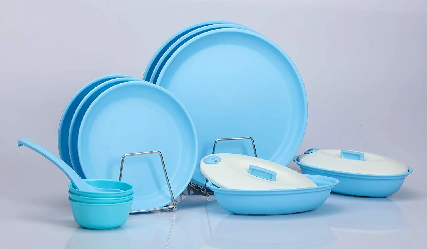 - Contents : 11 inch Dinner Plate 3 Pcs, 8 Inch Side Plate 3 Pcs, 230 ml Bowl (Katori) 3 Nos, Ladle 1 Nos,500 ml Serving Bowl (Katori) 2 Nos.