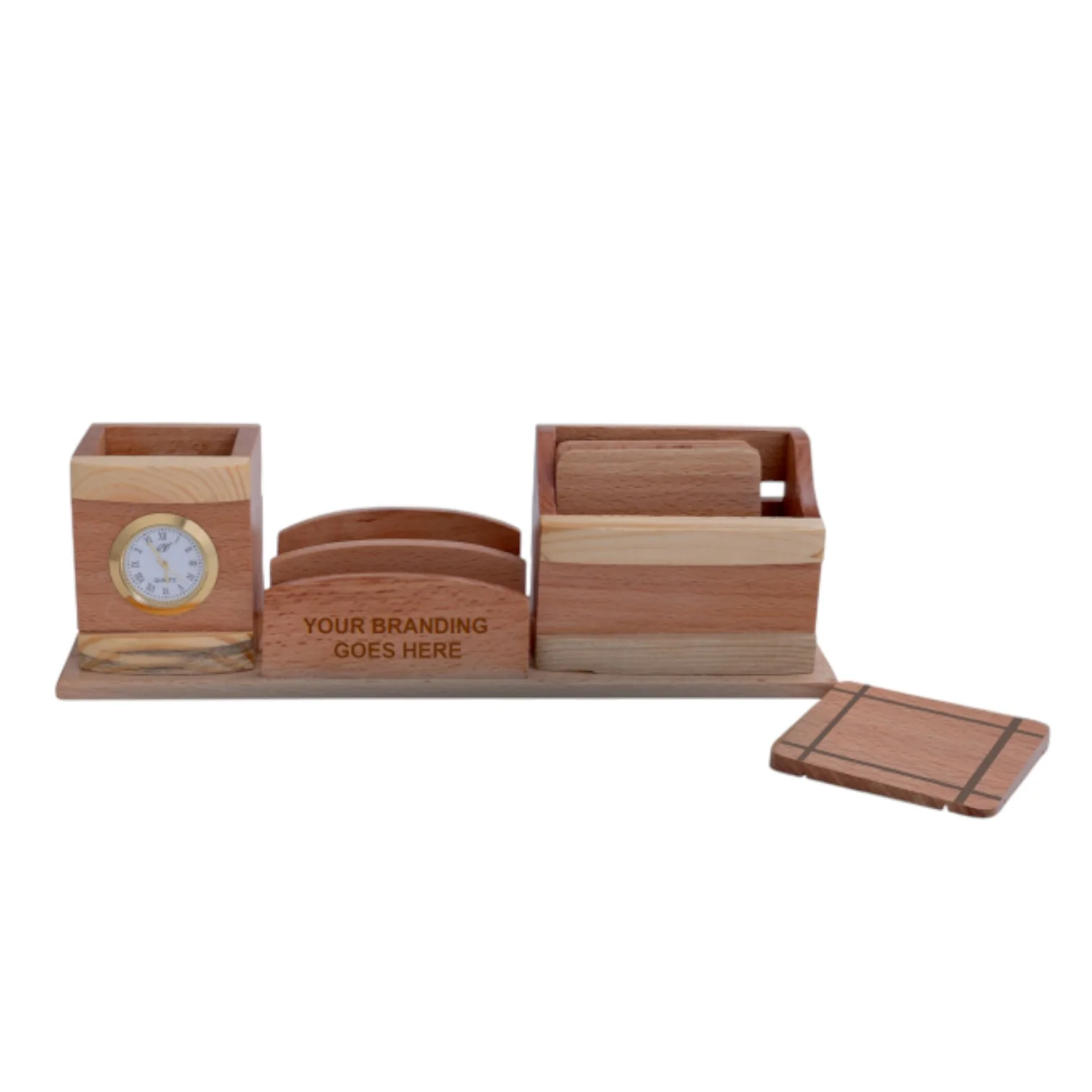 - Pen holder with Quartz Clock, Four Pieces Rectangle Wooden Coasters, Visiting Card Holder.