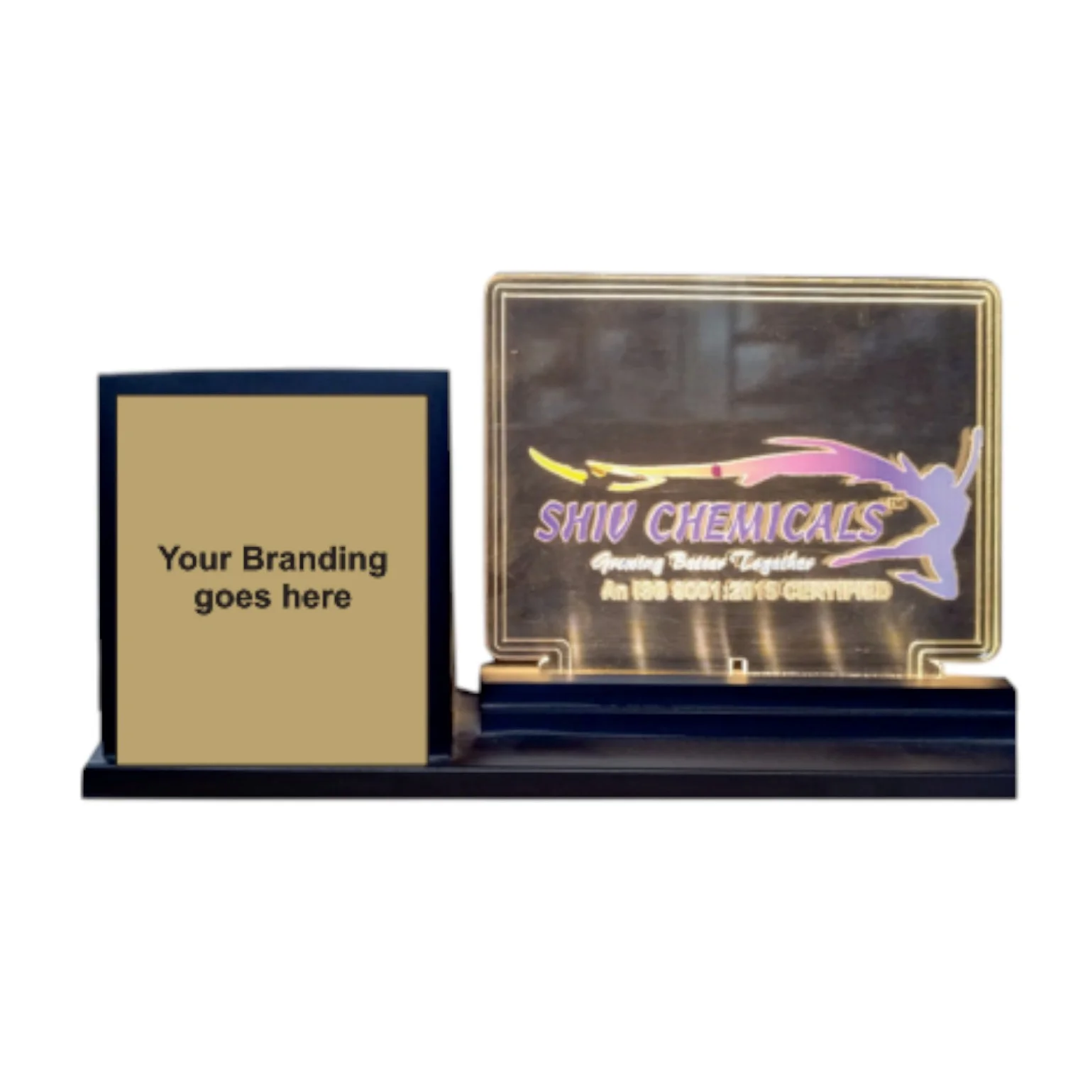 • Wooden Pen Stand with LED based Photoframe. Size : 6.5D x 27W x 10H Cms.